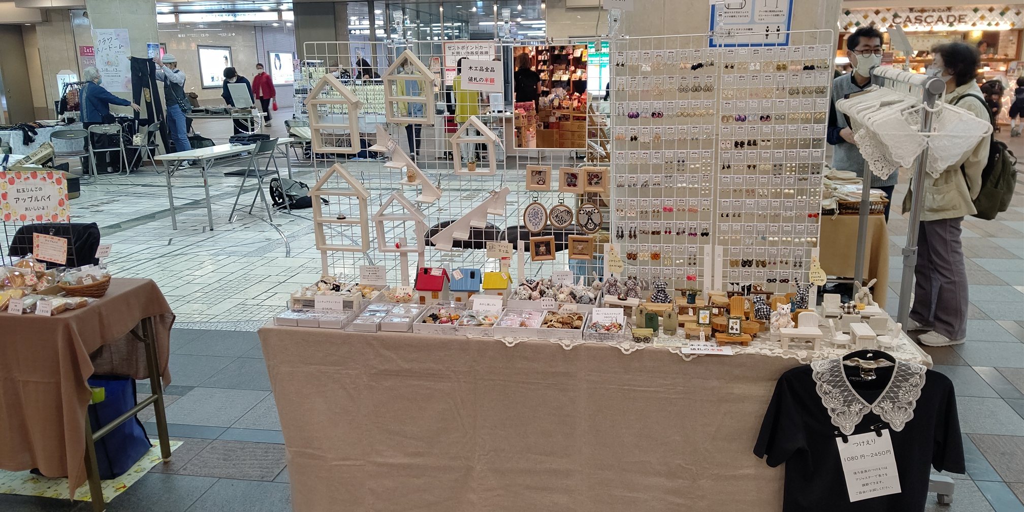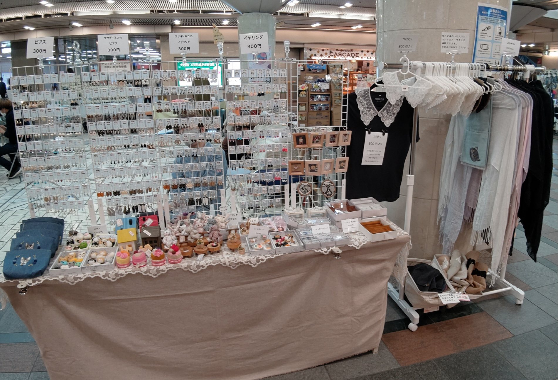 ゼスト御池にて、6時頃まで、アクセサリー、つけ襟、ストール、ぬいぐるみ、布小物など、販売しています。