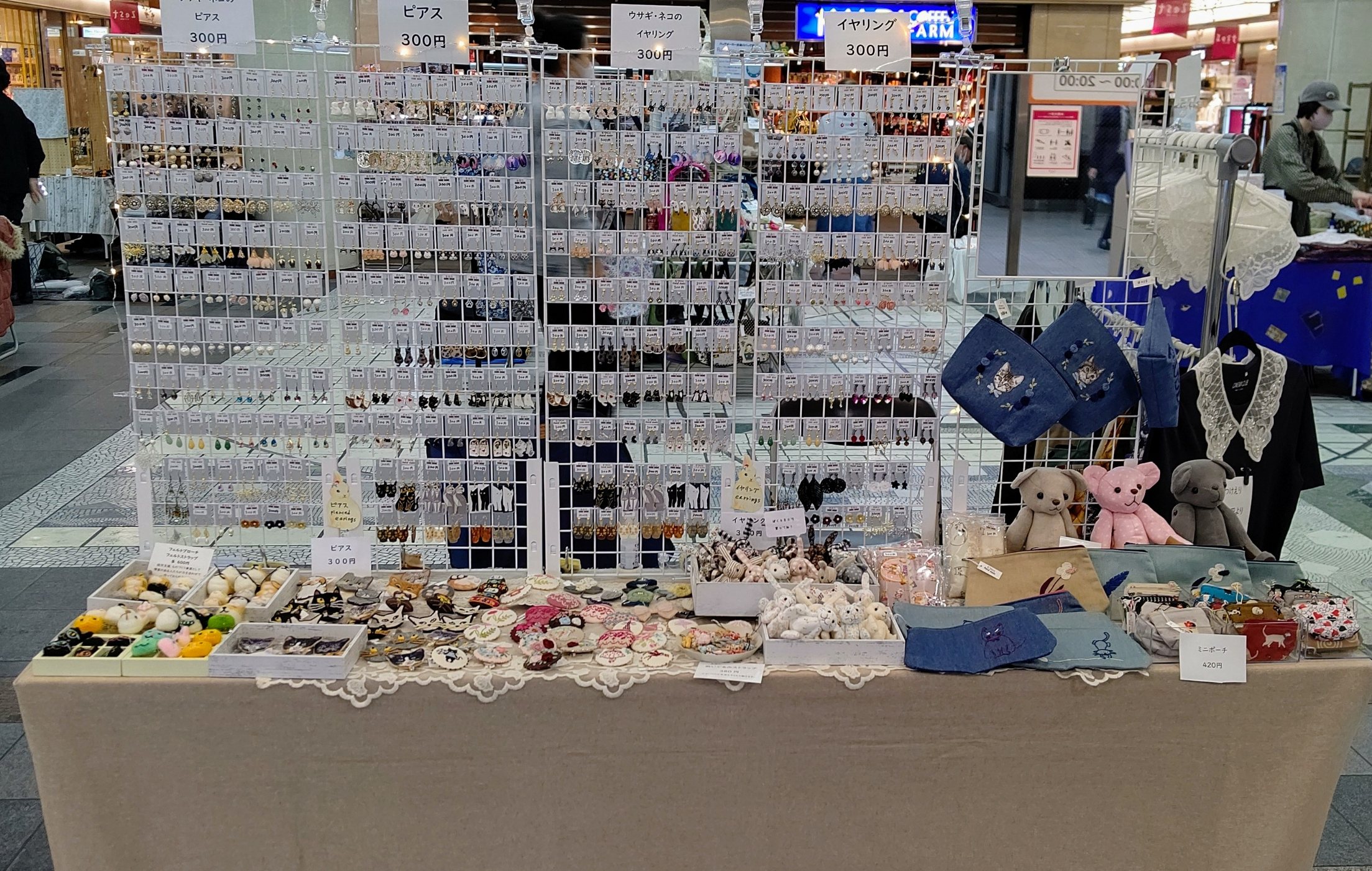 イヤリング、ピアス、バッグ、ポーチ、つけ襟やぬいぐるみなどワンコインの物も沢山あります。