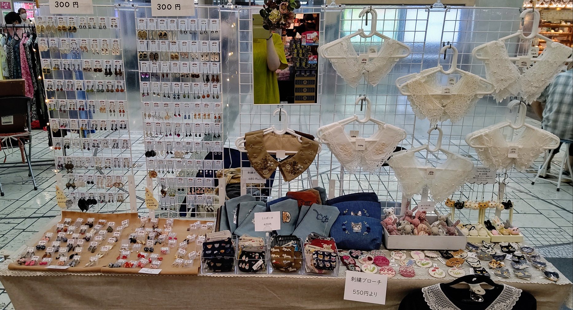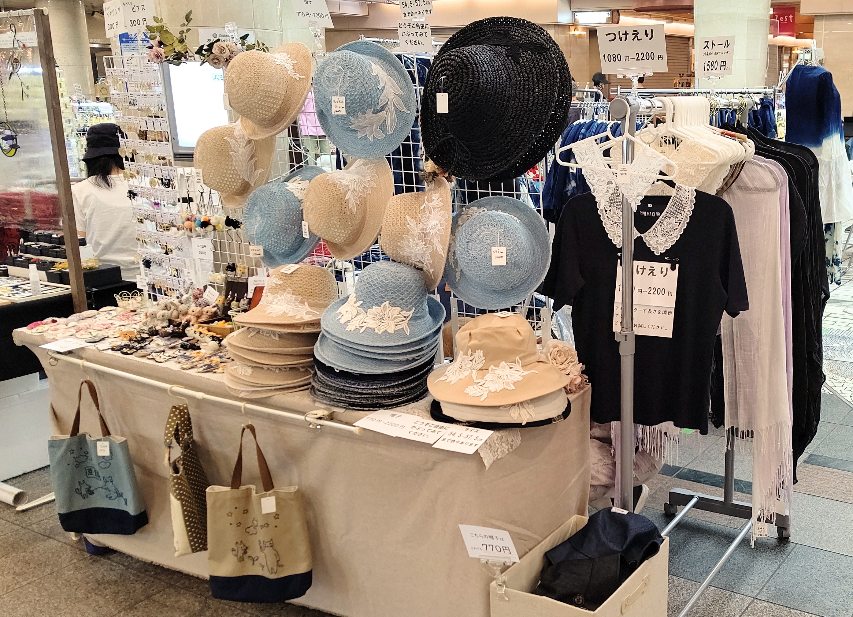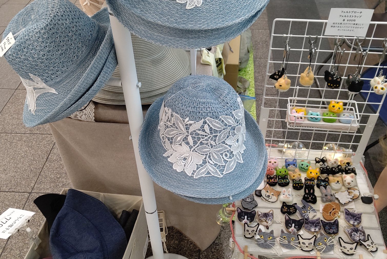 今日は、ピアスやイヤリング、ブローチなどのアクセサリーが中心ですが、夏に人気のレース帽子、レースつけ襟も持ってきました。